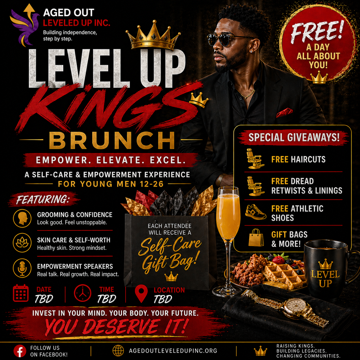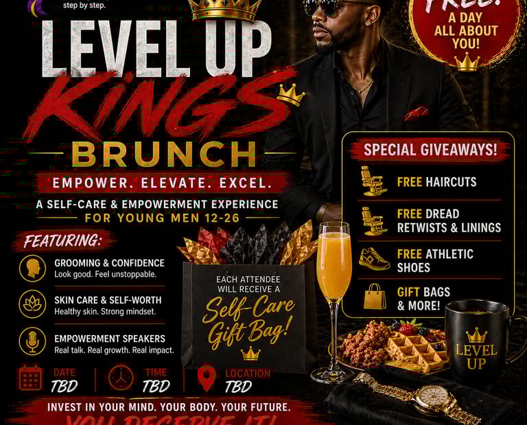 The Level Up Kings Brunch is a free, empowering self-care experience created to uplift, restore, and strengthen young men. Through real conversations, mentorship, grooming services, and motivational speakers, participants are poured into mentally, emotionally, and physically. This experience creates a space for brotherhood, confidence-building, and personal growth—equipping young men to level up in life, purpose, and manhood.