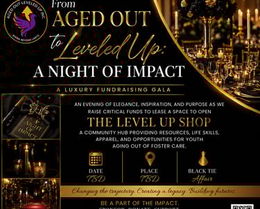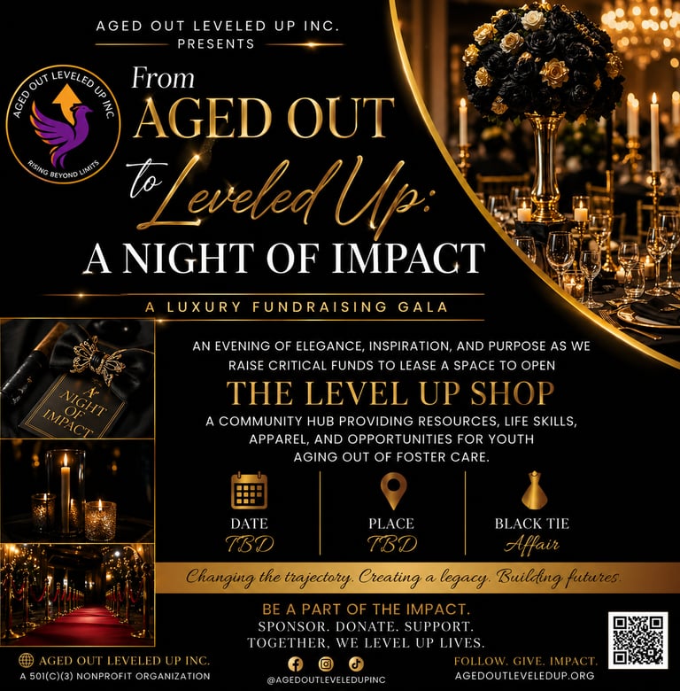 From Aged Out to Leveled Up: A Night of Impact is a luxury fundraising gala hosted by Aged Out Leveled Up Inc., designed to bring together community leaders, changemakers, and supporters for an unforgettable evening of elegance, purpose, and transformation.